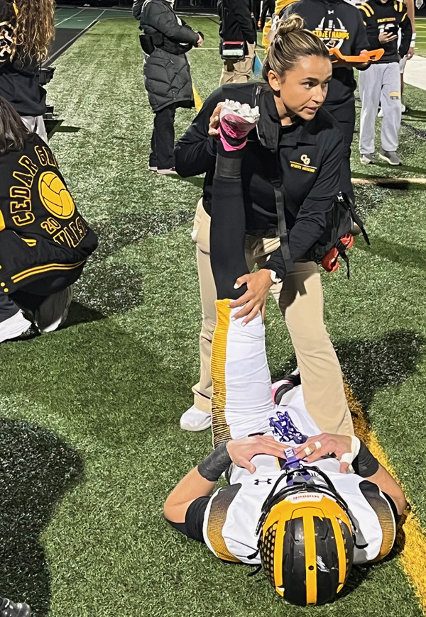 Cedar Grove player gets help loosening up before Friday night's North 2, Group 1 final at Lieder Field where the superb New Providence High School band entertained at the half.