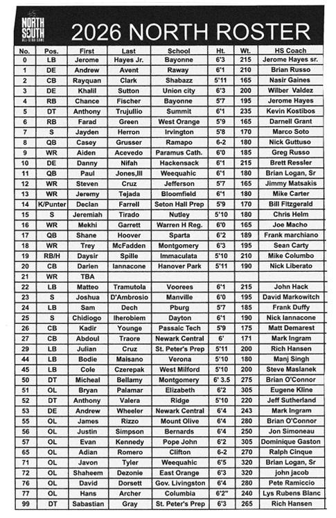 “It’s crazy how many great athletes will be on our North team,” said Tejada, who had the No. 7 best New Jersey time (7.4 seconds) and No. 37th nationally in the 55-meter dash this past winter indoor track season. “It’s going to be exciting to be able to play wide receiver, show off my speed, and play with some really good teammates in my final high school football game.