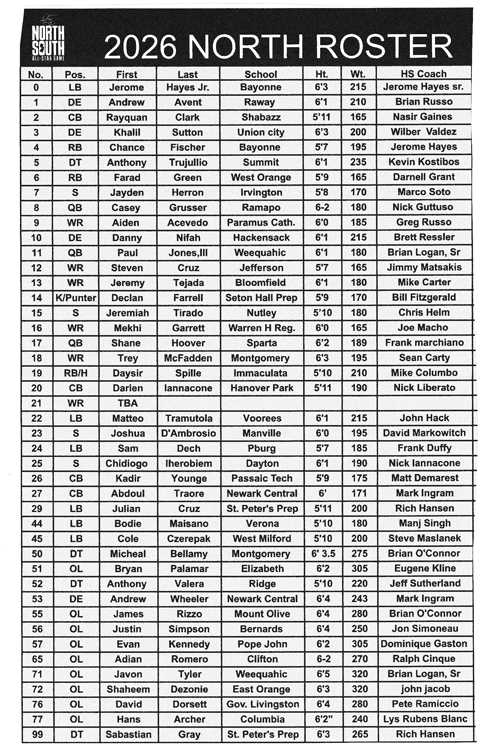 “I look forward to meeting all my teammates on the North squad. I know Chance Fischer (running back from Bayonne) going back to our junior football days playing against each other and it will be great to now be his teammate in a senior all-star game.”