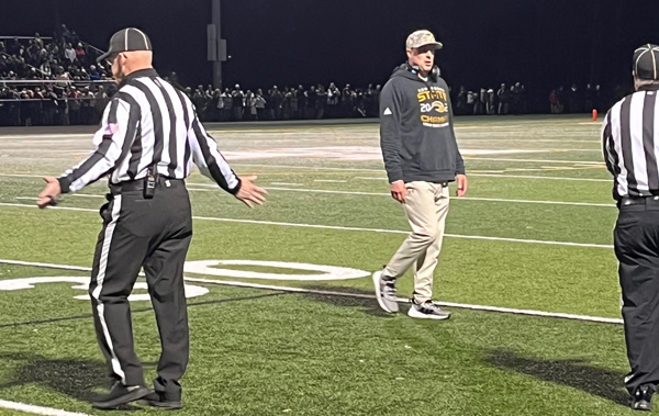 Cedar Grove coach Rob Gogerty seeks explanation from official after penalty call that was assessed against Panthers during Friday night's North 2, Group 1 playoff final at New Providence although nothing could ultimately slow down the defending sectional champs who could eventually celebrate program's second straight and 10th overall state title with 37-13 victory over Pioneers at Lieder Field. (Sideline Chatter photos)