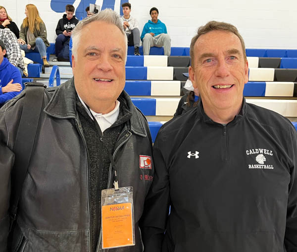 Renowned NJ Hoops editor Jay Gomes meets up with Caldwell Coach Mike Fess in the JCHS gym during visit to West Caldwell to take in Chiefs game. (Sideline Chatter photo)