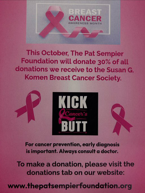 During October the Coach Pat Sempier Foundation will donate 30 % of all donations to the Susan G. Komen Breast Cancer Foundation as a part of the efforts with the theme to ‘Kick Cancer’s Butt.’