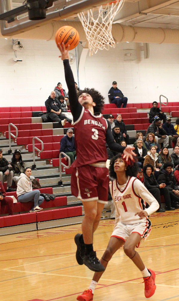 Bloomfield, with standout guard AJ Cruz (3), may trail local rival Montclair in terms of power points, but the Bengals defeated the Mounties, 55-44, Thursday night, to move up to No. 8 in a very wide-open North 1, Group 4 bracket with Montclair remaining at No. 1 in power point tabulations. Mounties are led by Mason Determan (above) while they will look to right the ship in states. (Photos by Jerry Simon and Ayden Acebo)