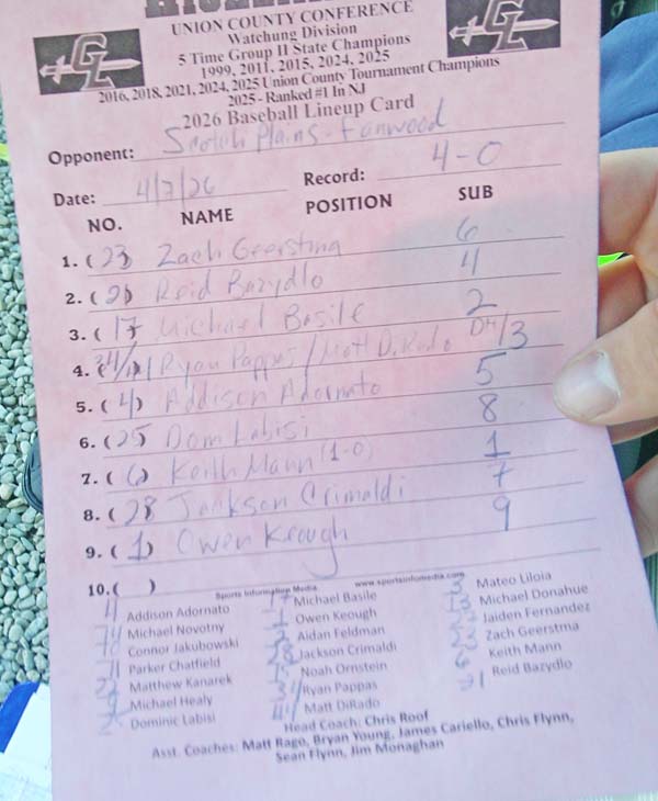 It was also good enough to be the punctuation mark as GL established a new state-record with its 39th straight victory. In a contest that took three hours and 10 minutes to complete in temperatures that were 40 degrees colder than a week ago, GL defeated Scotch Plains 12-3 in Union County Conference-Watchung Division action this past Tuesdayy (April 9) at Scotch Plains.