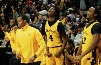 Shabazz coach Nas Barrino (left) along with players Shamir Young (4) and Isaiah Roman (12) are totally into all that has been transpiring on the court as the Bulldogs were on the way to 51-48 victory over Thrive Charter in the Group 1 state final on Sunday, March 15, at Rutgers U and inside Jersey Mike's Arena. (photo coutesy of Shabazz Athletics)